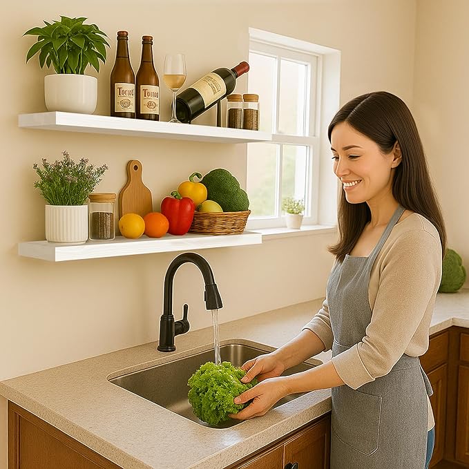 • MULTIFUNCTIONAL DECORATIVE SHELVES: Modern rustic style floating wall shelves are suitable for a variety of scenarios. Use it in the kitchen to store spices, bottles, cups; install it in the bathroom to store shampoo, conditioner, body wash and more. Also perfect for bedroom, living room, office, etc., beautiful and space-saving