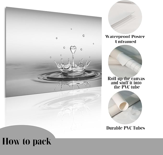 - Black and White Bathroom Wall Art: Featuring a beautiful heart water drop motif, this black and white zen wall art provides a calming focal point, promoting mindfulness and tranquility in your space.