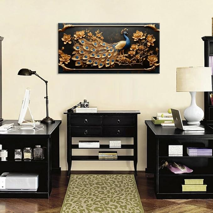 ZESTRILIA Pretty Peacock Wall Art for Living Room Office Gold Country Rustic Retro Asian Canvas Painting Prints Golden Vintage Elegant Peackock Artwork Dining Bedroom Decor (40x20 Inches)