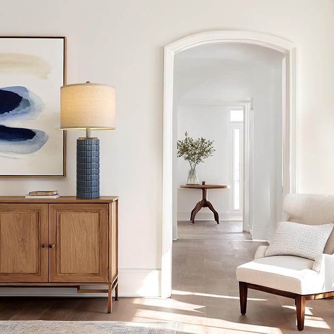 - Dark Blue Design: The base of this living room lamps is dark blue, adorned with light white vertical stripe accents. Made from a high-quality ceramic base and a handcrafted linen shade, this living room table lamps add a glance of elegance to your home and creates a warm and cozy atmosphere in the evening, an ideal choice for home decors like farmhouse decor and modern decor.