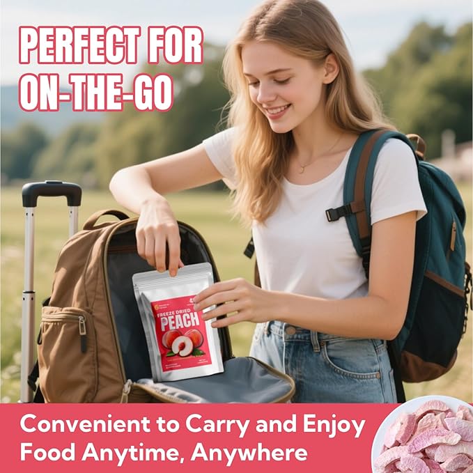 - 【SHELF-STABLE DRIED PEACHES FOR ACTIVE LIVES】 Dehydrated peaches stay fresh for months in airtight packaging. Toss resealable pouches in gym bags, desks, or bug-out kits—ideal for hiking, road trips, or quick snacks. No refrigeration needed!