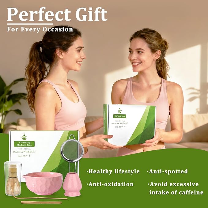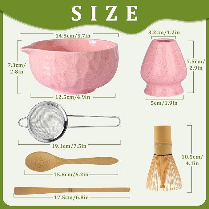 - 【🌸 Complete Matcha Whisk Set】This exquisite matcha set, featuring a stone-grain texture and a pink glazed bowl,We have fused the delicate beauty of a stone-grain with a natural texture. Our philosophy:Slow down and Integrate into a healthy lifestyle. matcha whisk set includes: 1×14 oz Ceramic Matcha Bowl, 1× Bamboo Matcha Whisk, 1×Whisk Holder,1× Bamboo Scoop, 1×Spoon and 1× Stainless Steel Sifter. This matcha kit makes it effortless for beginners and tea enthusiasts alike to enjoy a calming, frothy cup of matcha.