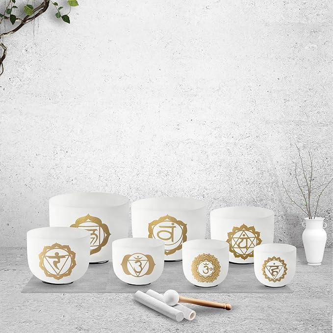 - Complete 7-Chakra Portable Set-This 7-piece 432Hz crystal singing bowl set (7-12 inch) includes precision-tuned sizes: 7" B Crown, 8" A Third Eye, 8" G Throat, 9" F Heart, 10" E Solar Plexus, 11" D Sacral, 12" C Root. Comes with a rubber mallet, two suede strikers, seven O-rings, and two lightweight cases for home meditation, energy sessions, or travel.