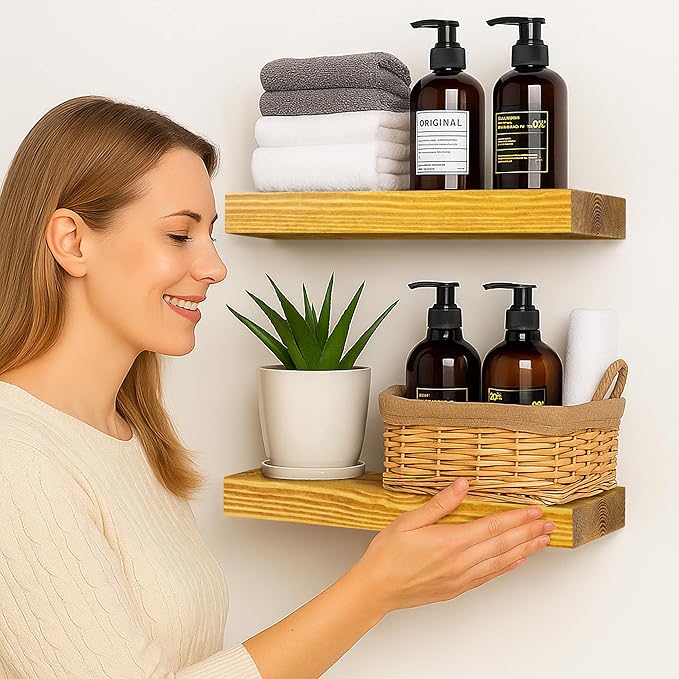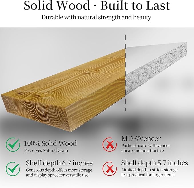 - ๐๐จ๐ฅ๐ข๐ ๐๐จ๐จ๐๐๐ง ๐ ๐ฅ๐จ๐๐ญ๐ข๐ง๐ ๐๐ก๐๐ฅ๐ฏ๐๐ฌ โ Crafted by hand from real pine, each floating shelf shows off unique wood knots and is stained to create a warm, rustic look that feels right at home