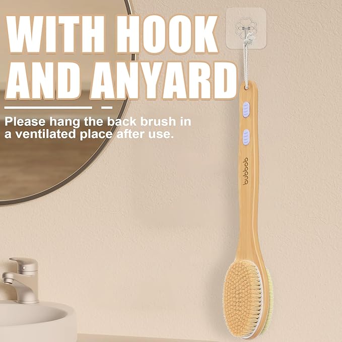 - Double-sided Bristles(body scrubber): One side has stiff natural bristles for dry brushing and the other side has soft nylon bristles for wet brushing
