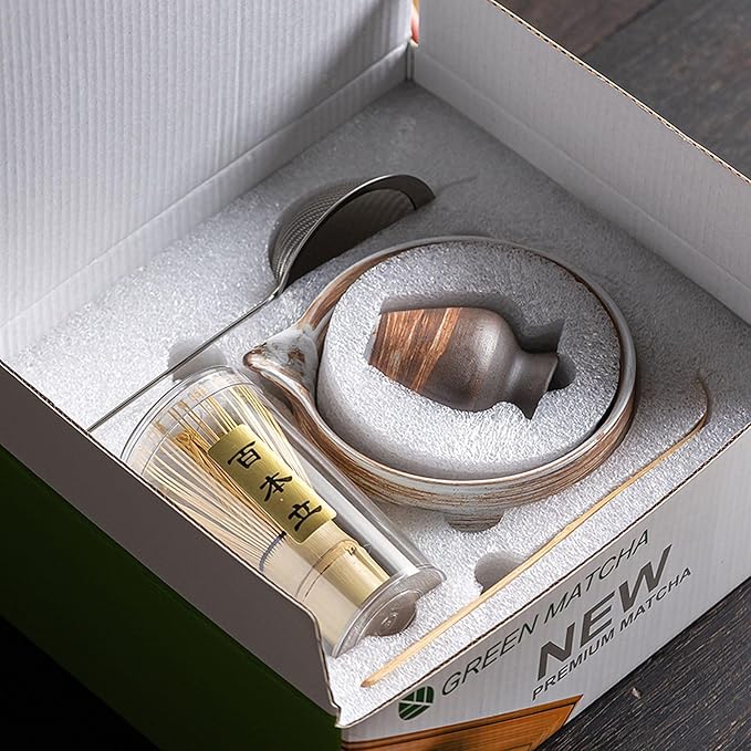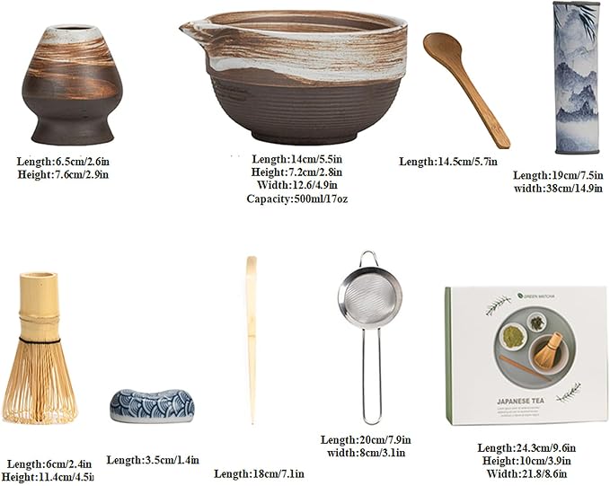 - [Gift Box Packaging]: Scizorito Matcha 8-piece set, 1 tea whisk, 1 tea whisk stand, 1 Matcha bowl, 1 tea stirrer, 1 tea spoon, 1 powder sieve, 1 tea stirrer stand, 1 tea towel.