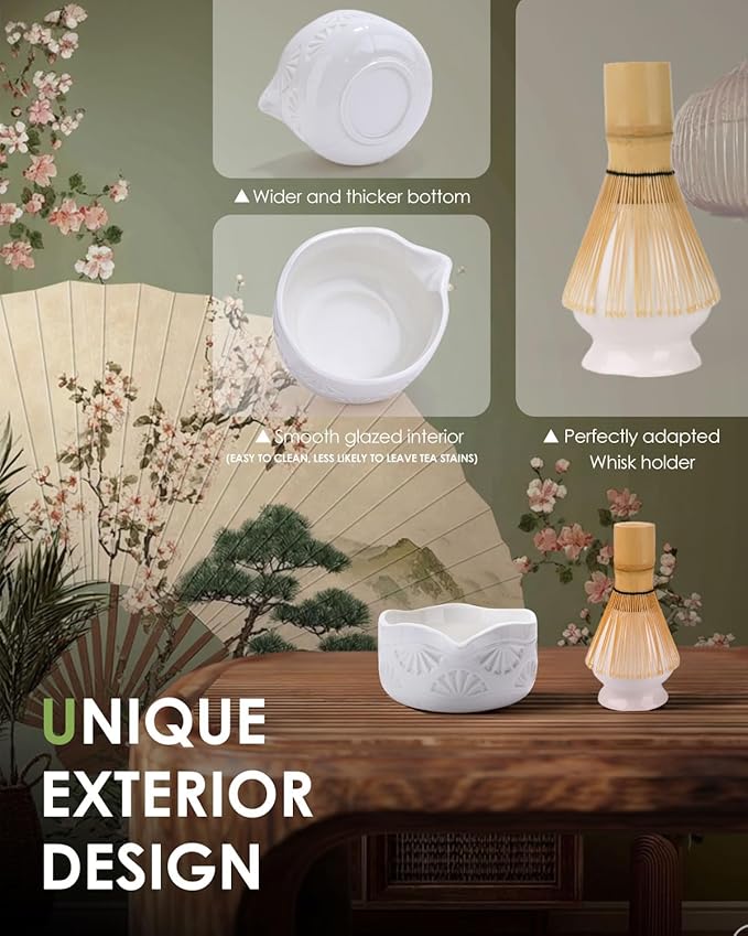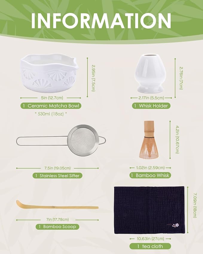 • Complete Matcha Set:This matcha set includes everything needed for an traditional matcha experience: - 1x handmade bamboo matcha whisk (chasen) - 1x bamboo scoop (chashaku) - 1x stainless steel sifter - 1x 530ml/18oz ceramic matcha bowl (chawan) - 1x whisk holder - 1x tea cloth - 1x Hand-Book
