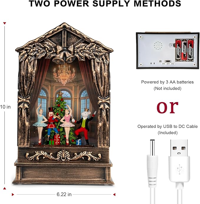 - 💂🏻【Nutcracker Suite Scene】Lighted the Sugar Plum Fairy, King Rat, Nutcracker and Clara with a decorated Christmas tree and presents surrounded by swirling glitter Water Lantern Snow globe. When turned on a warm LED shines down on the figurine and swirling glitter to give our water lantern a whimsical look for the Holiday Season.