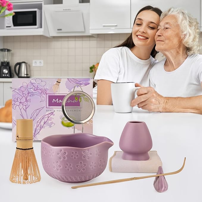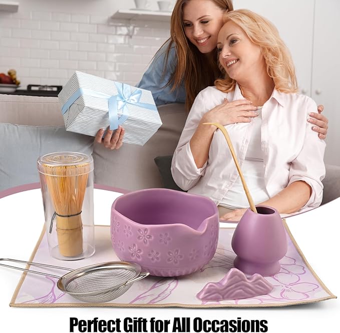 APLSTOW Matcha Whisk Set - Traditional Japanese Handmade Bamboo Matcha Whisk and Holder, Matcha Bowl,Bamboo Scoop, Scoop Rest, Sifter and Tea Towel (Purple)
