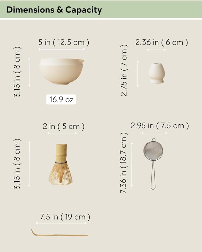 • All-in-One 5-Piece Set – Includes everything you need for matcha at home: a natural bamboo whisk, a ceramic whisk holder, a bamboo scoop, a fine stainless steel sifter, and a durable ceramic matcha bowl. Compact and easy to store, perfect for both beginners and daily rituals.