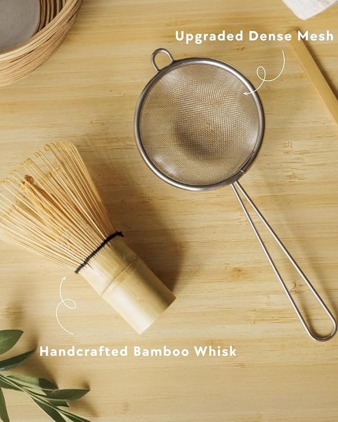 • Fine Stainless Steel Sifter & Bamboo Whisk – The upgraded dense mesh sifter creates extra-fine, fluffy powder. The handcrafted bamboo whisk naturally flexes to whip matcha into a smooth, foamy texture. Durable and versatile, they can also be used beyond matcha.