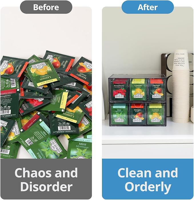 • 【Stackable Design】The bottom groove design allows the tea bag box to be stacked, and comes with non-slip mats ensure stability. The top of the box can hold your other items. When taking out the tea bag, simply pull out the drawer without removing anything on the top of the box, saving storage space