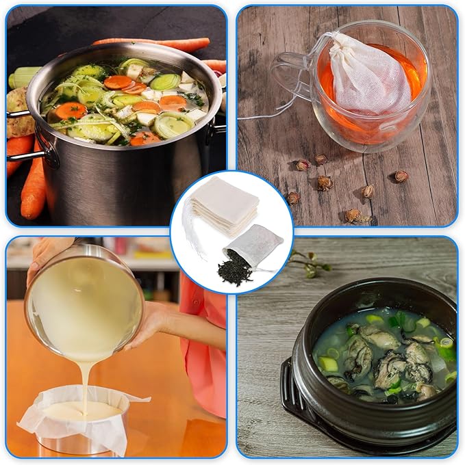 - 【Practical Design】Our cheesecloth bags feature a fine mesh design that allows liquids to pass through while preventing spices from leaking during cooking. There is a drawstring on the top of tea filter bag, pull the string to close the top, then the tea bag is bunched at the top.