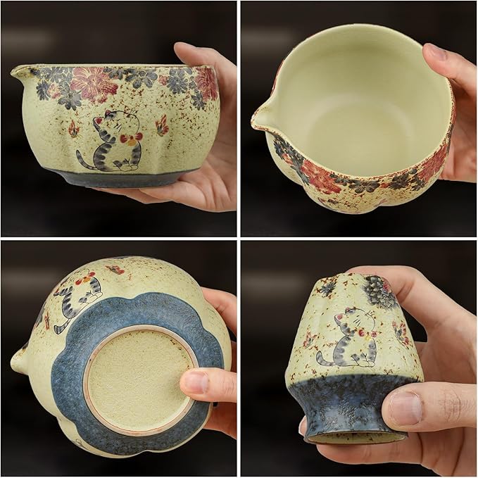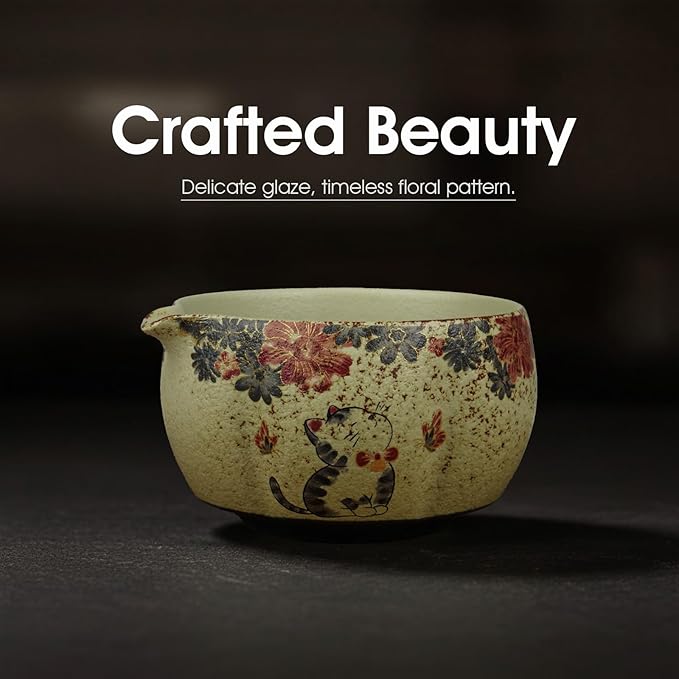 - ๐พ Charming Cat & Floral Design โ Featuring delicate cat and blossom motifs on the chawan and whisk holder, this matcha set adds a touch of playfulness and serenity to your tea ritual. A calming mint-green glaze evokes the freshness of spring mornings.